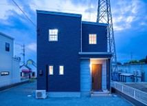 ネイビーと木目のトレンド感ある外観が特徴。あえて吹き抜けにはせず、断熱・気密性を重視した設計になっています。